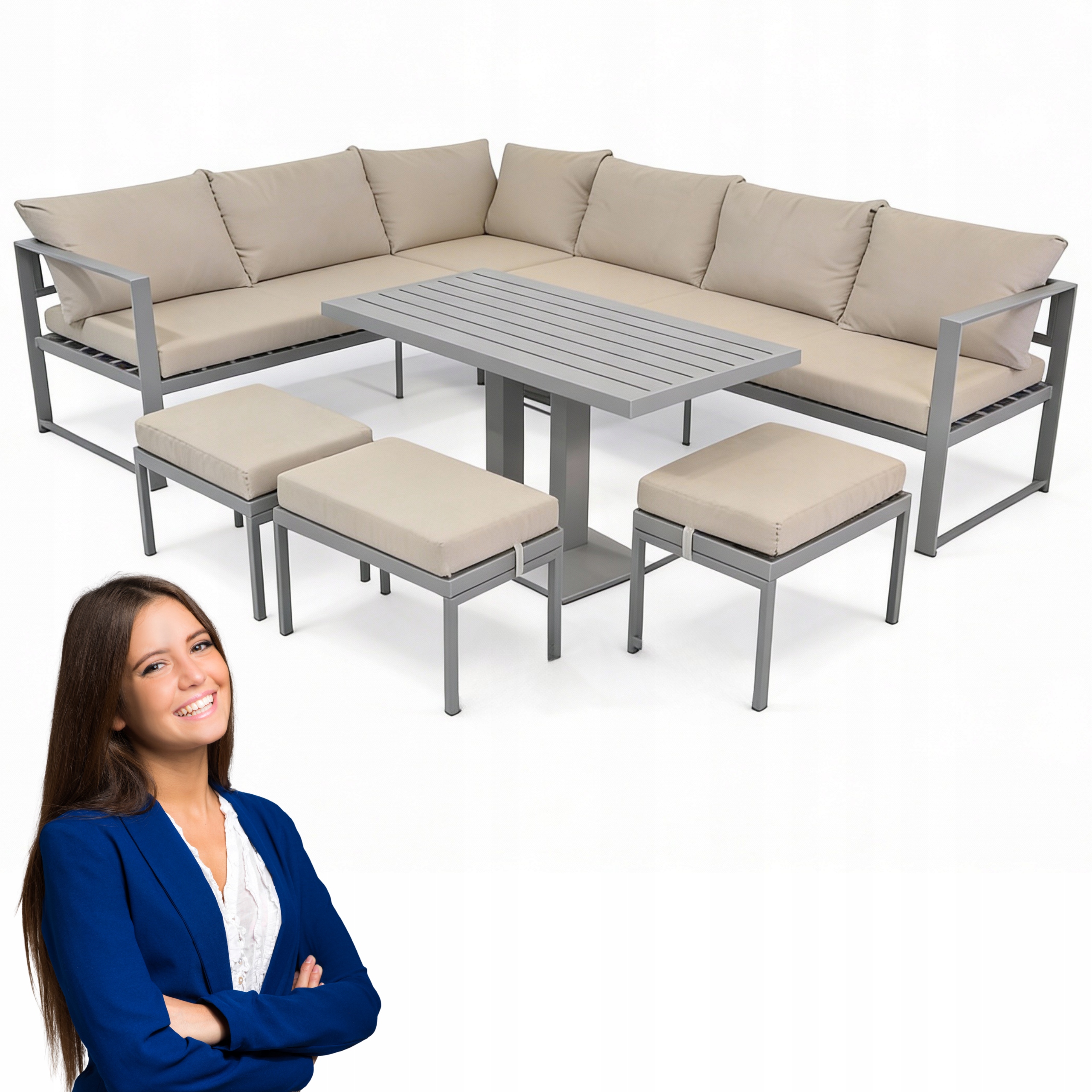 Nowoczesny Komplet Wypoczynkowy Premium: Duży Narożnik, Stół Obiadowy i 3 Pufy